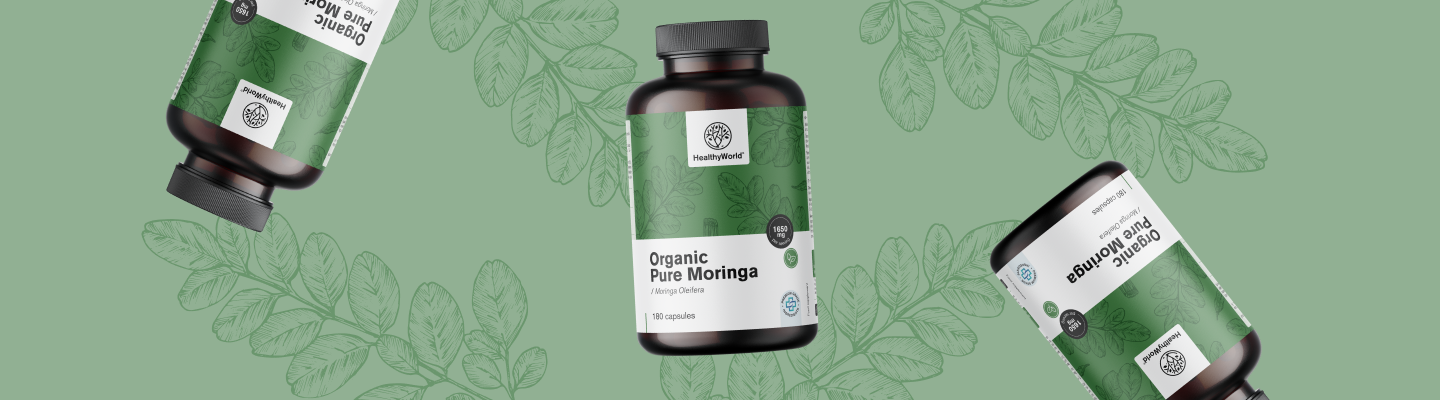 Összetevők: moringa* por (Moringa oleifera), hidroxipropil-metil-cellulóz (HPMC; növényi kapszulahéj). *Minősített biotermelésből származik. SI-EKO-002. Mezőgazdaság az EU-n belül és kívül.